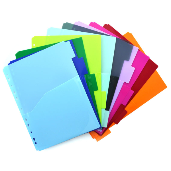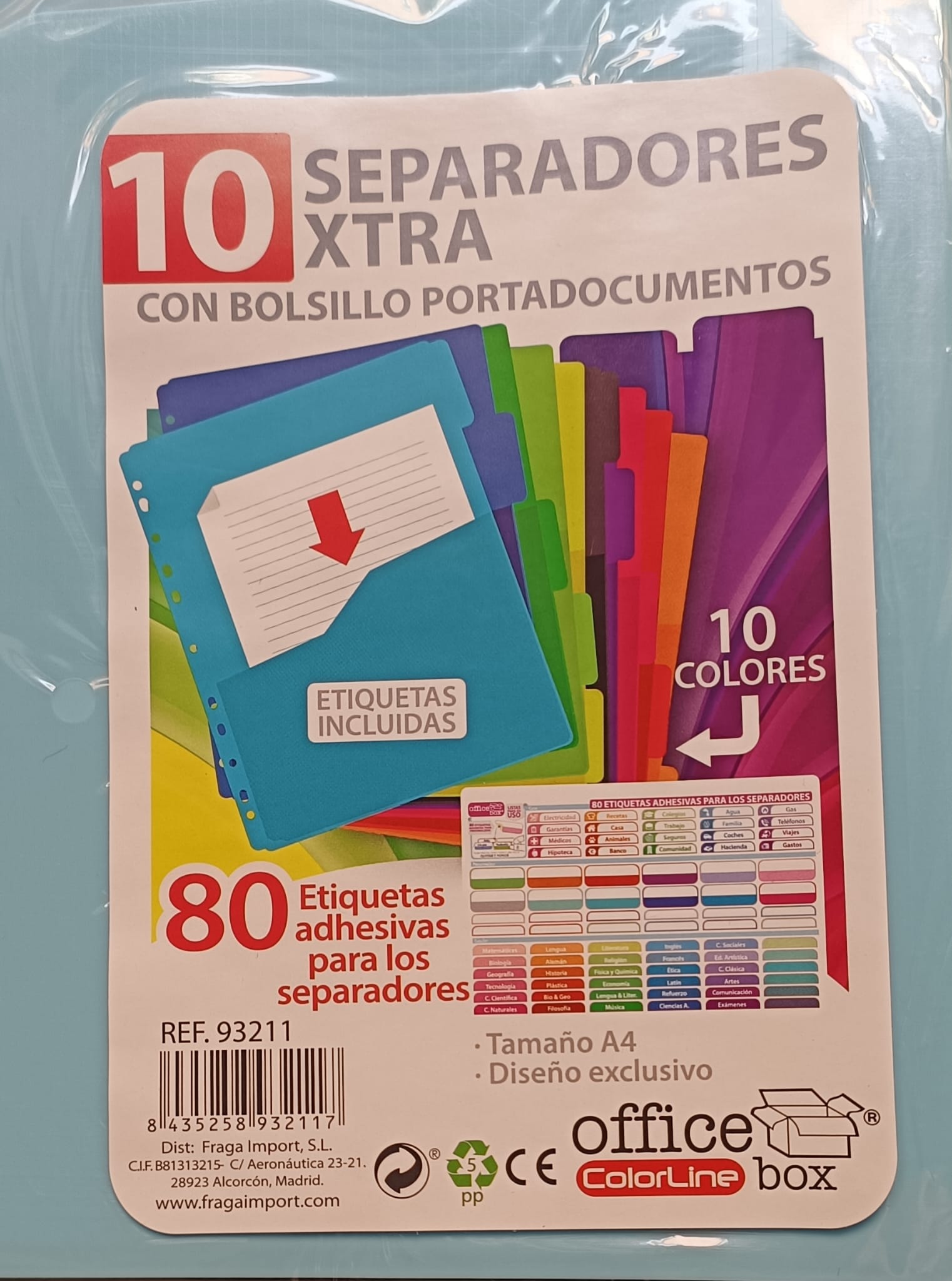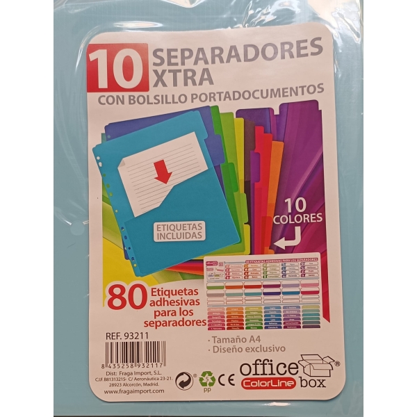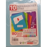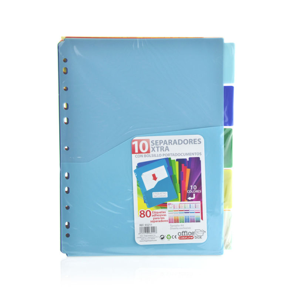 conjunto de diez separadores diseñados para organizar documentos en archivadores y carpetas. Estos separadores están fabricados en plástico duradero y están perforados para adaptarse a diversos sistemas de anillado, lo que facilita su uso en una amplia variedad de carpetas y archivadores.