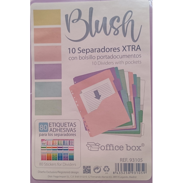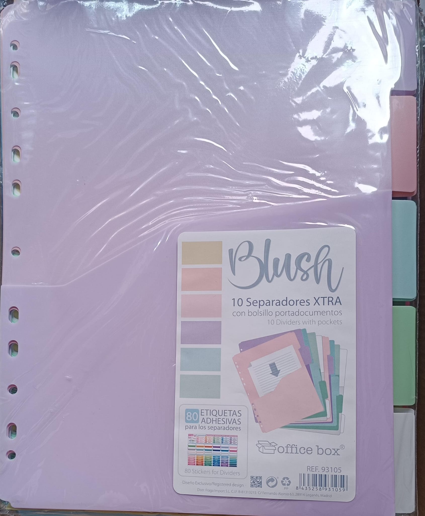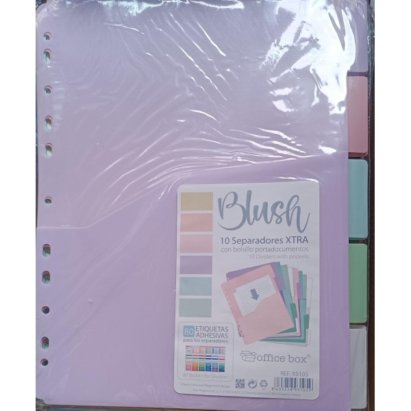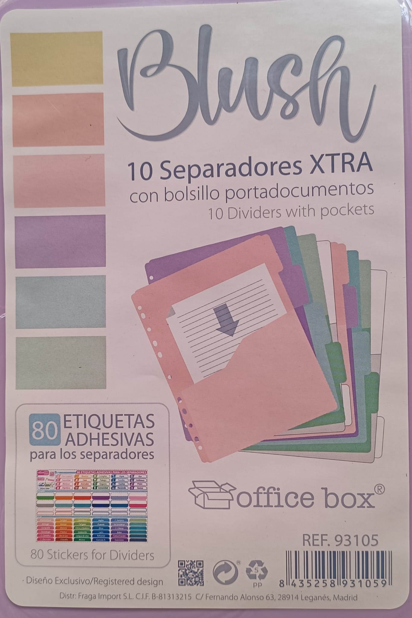 conjunto de diez separadores diseñados para organizar documentos en archivadores y carpetas. Estos separadores están fabricados en plástico duradero y están perforados para adaptarse a diversos sistemas de anillado, lo que facilita su uso en una amplia variedad de carpetas y archivadores.